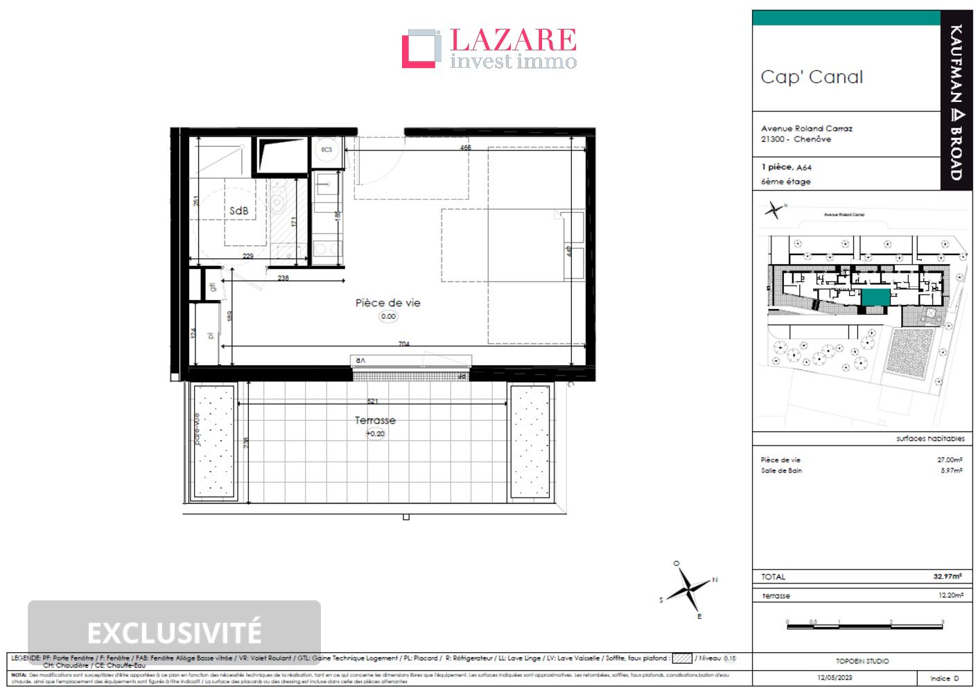 Au sein de la résidence CAP’CANAL, neuve et sécurisée avec ascenseur et prestations de qualité, retrouvez ce bel appartement T1 de 32,97 m2 au 6ème étage de l’entrée A avec une terrasse de 12,20 m2 exposée Sud/Est dans le prolongement du séjour.