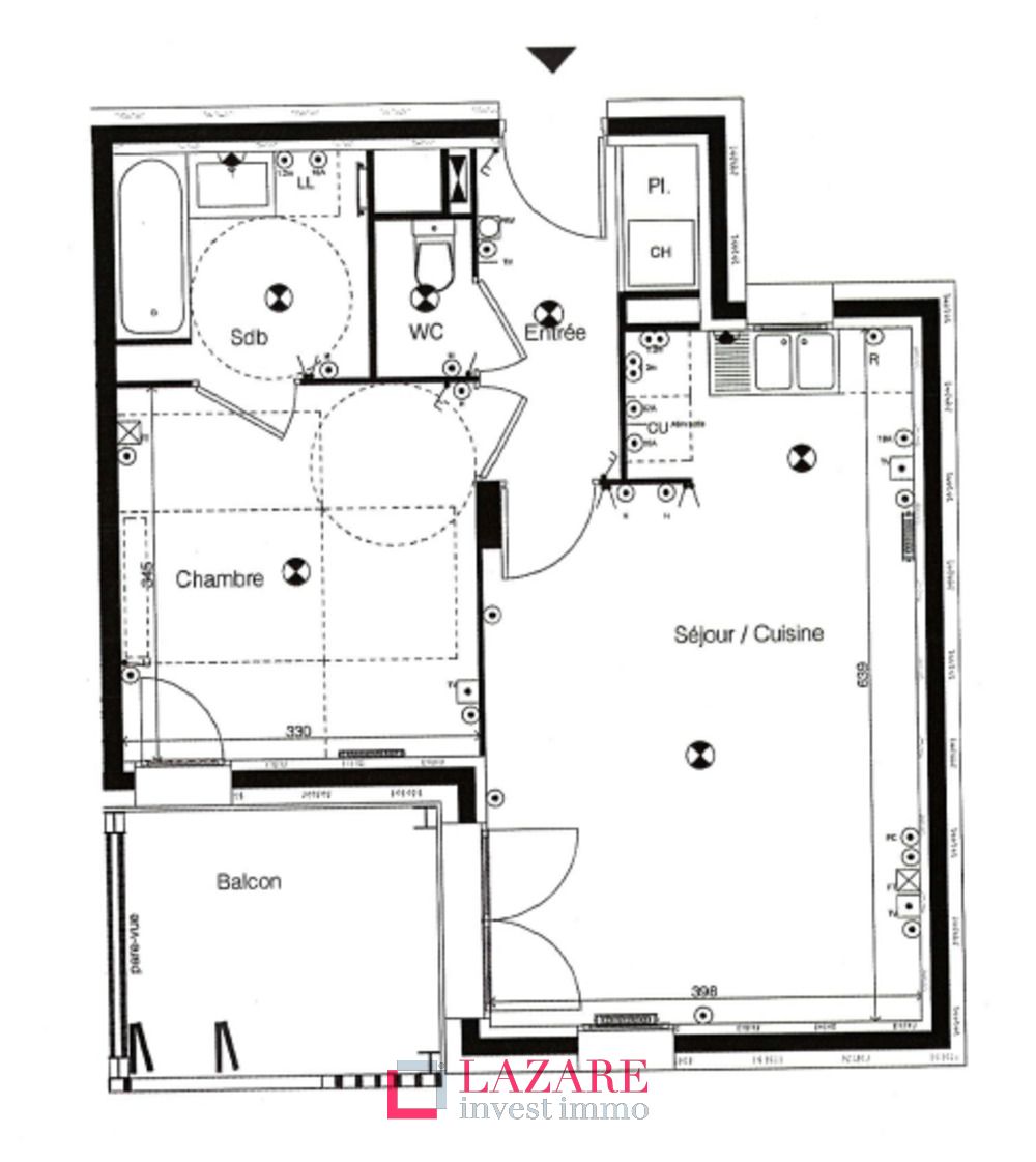 Bien composé d'une entrée avec placard intégré, donnant sur séjour/cuisine équipée de plus de 23 m² avec accès sur balcon/terrasse.