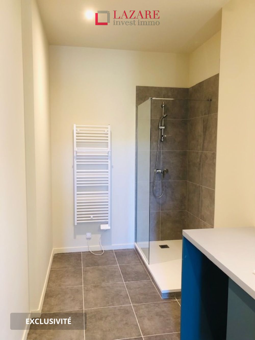 T3 composé d 'une entrée avec placard, d’un séjour avec une cuisine ouverte aménagée et équipée ( meubles hauts et bas, évier avec égouttoir et robinet mitigeur, plan de travail et crédence, plaques de cuisson 4 feux, hotte aspirante, emplacements réfrigérateur et four, attente pour LV ), de deux chambres avec placard, d’une salle de bains ( meuble vasque et vasque avec robinetterie mitigeuse, miroir avec éclairage, receveur de douche et robinetterie de type mitigeur thermostatique avec flexible et douchette et pare-douche, sèche-serviette électrique ), d'un WC indépendant .