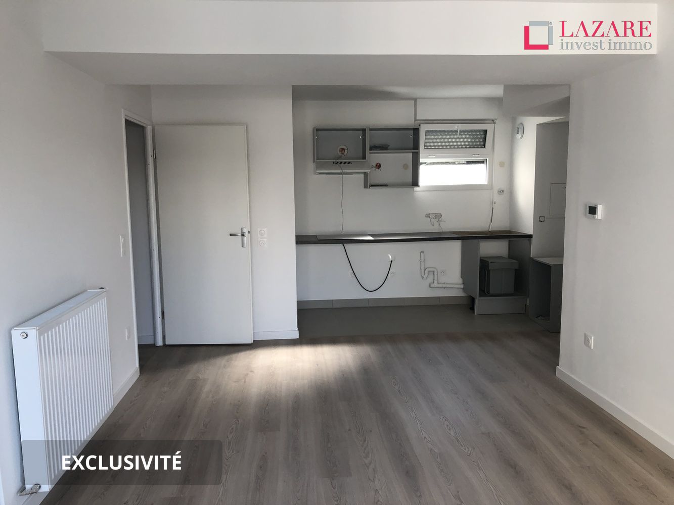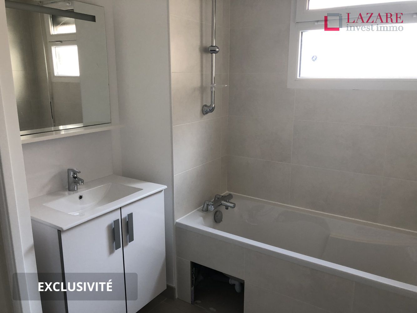 Ce T3 est composé d'une entrée avec placard, d'un lumineux séjour avec une cuisine ouverte équipée et aménagée ( meubles hauts et bas, hotte aspirante, emplacement petit four, plan de travail avec plaque vitrocéramique 4 feux, un évier en inox avec un bac et égouttoir, emplacements pour appareils électro-ménagers, alimentation et évacuation en attente LL/LV ), de deux chambres, d'un dégagement avec rangement, d'une salle de bains ( meuble vasque et vasque compris robinetterie mitigeuse, baignoire compris douchette et flexible sur barre, miroir avec bandeau lumineux ), d'un WC indépendant.