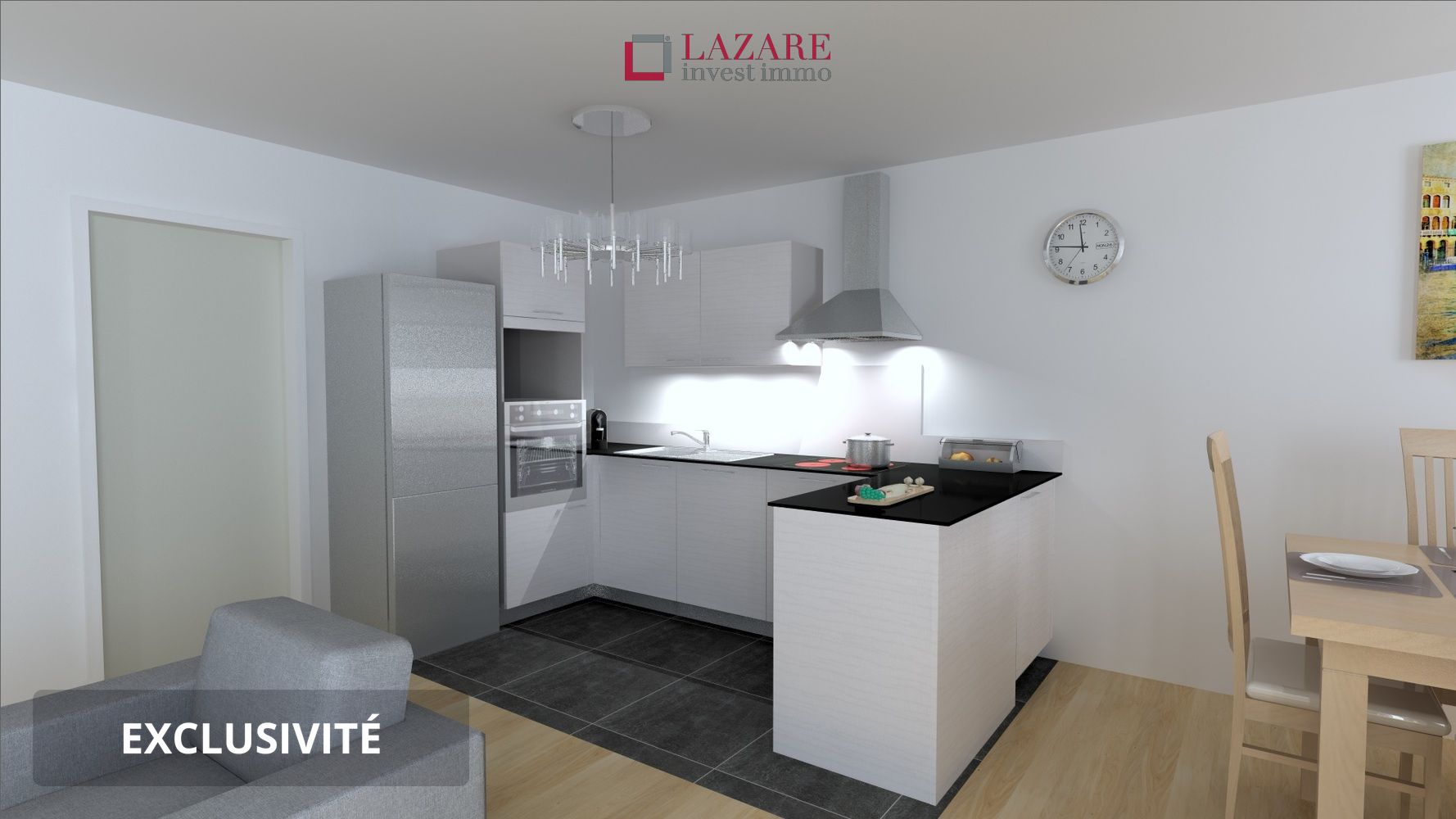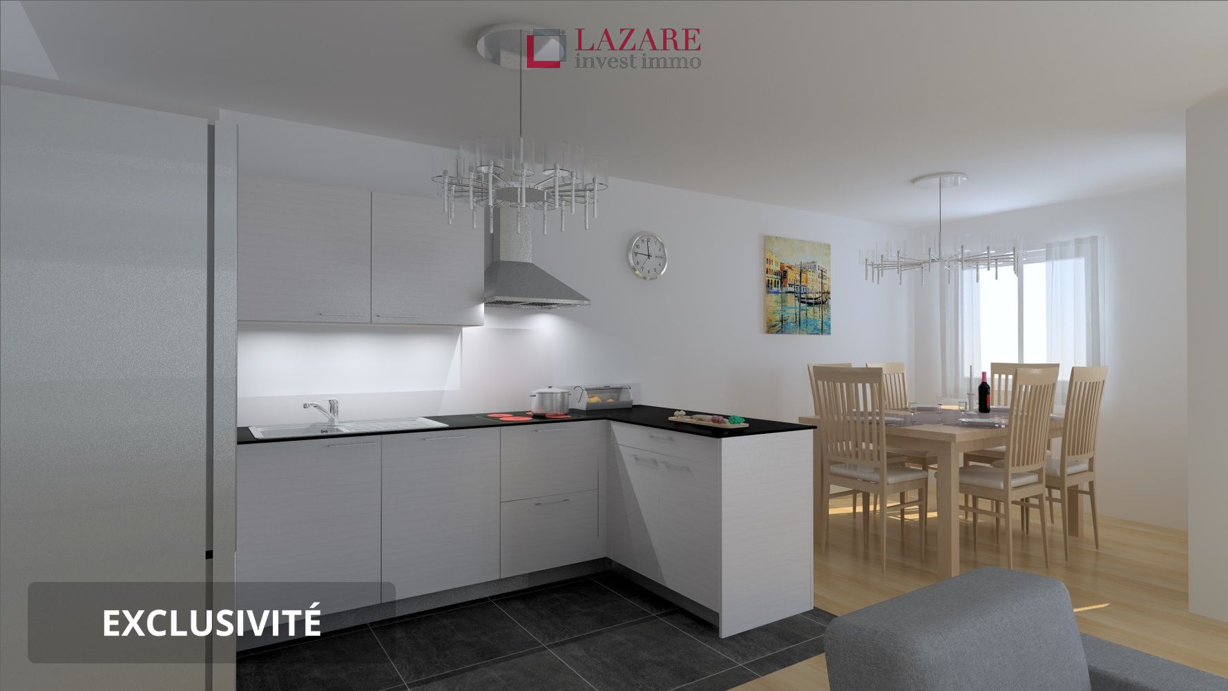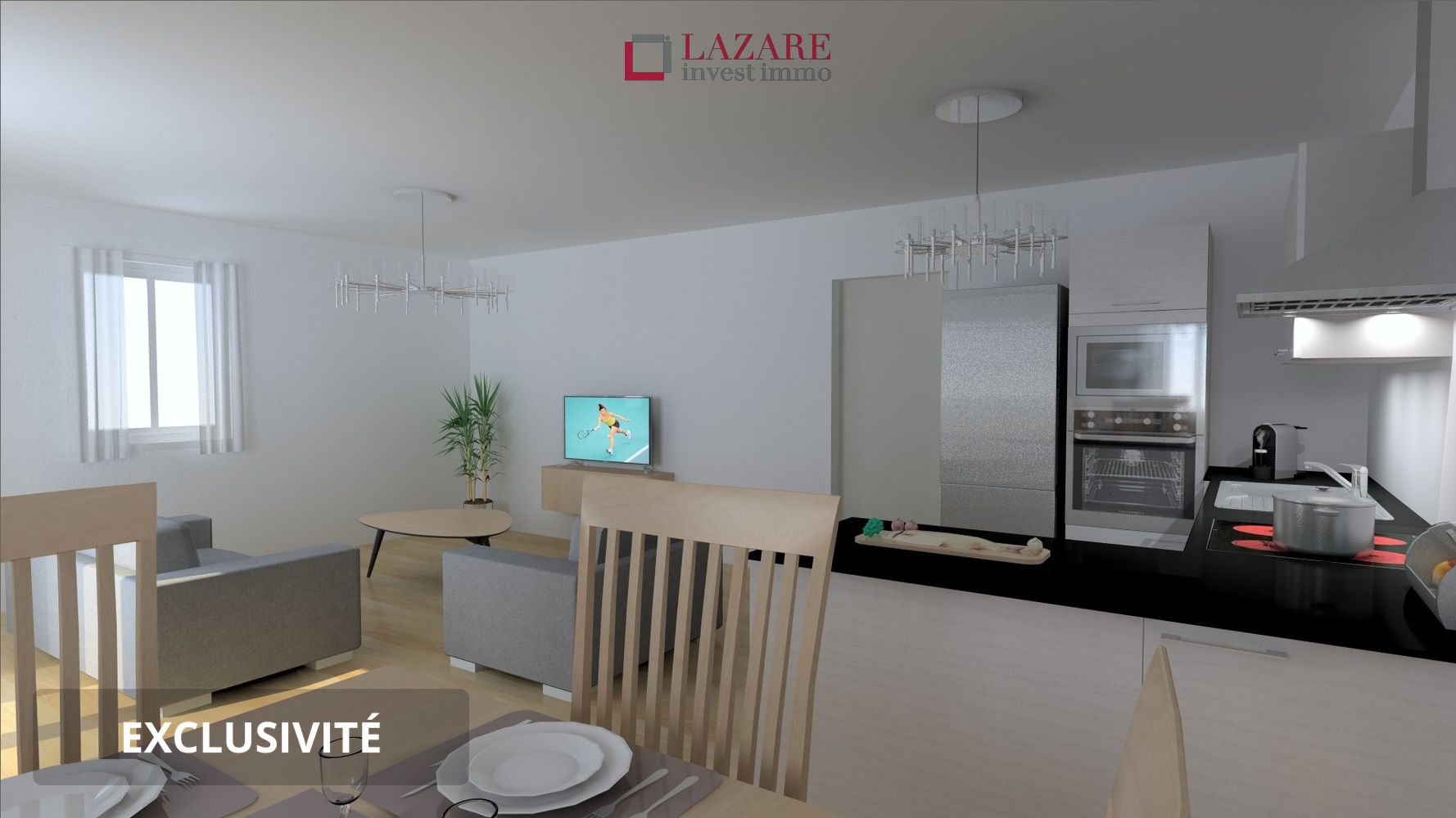 T3 composé d'un hall d'entrée avec placard et dégagement, d'un lumineux séjour avec cuisine ouverte aménagée et équipée ( évier avec robinetterie mitigeuse, crédence et plan de travail, hotte, four, lave-vaisselle, plaque vitrocéramiques, meubles hauts et bas ), d' une salle à manger, d'une chambre, d'une salle de bain ( meuble vasque et vasque compris robinetterie mitigeuse, miroir avec point lumineux, receveur de douche, compris douchette et flexible sur barre, arrivées et évacuations pour LL ) et d'un WC indépendant ( avec lave - mains).